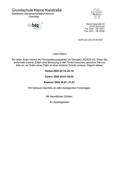 Seit 2007 besteht unter der Trägerschaft der dobeq GmbH der offene Ganztag für mittlerweile 202 Kinder. Diese werden von Montag bis Freitag von 7:30 bis 15:00 Uhr bzw. 16:00 Uhr betreut. Für berufstätige Eltern gibt es eine Spätdienstgruppe bis 16:30 Uhr. In enger Anlehnung an das Leitbild und das Konzept der Schule verstehen wir den Ganztag als Ort, an dem jedes Kind mit seiner ganzen Persönlichkeit wertschätzend aufgenommen wird.